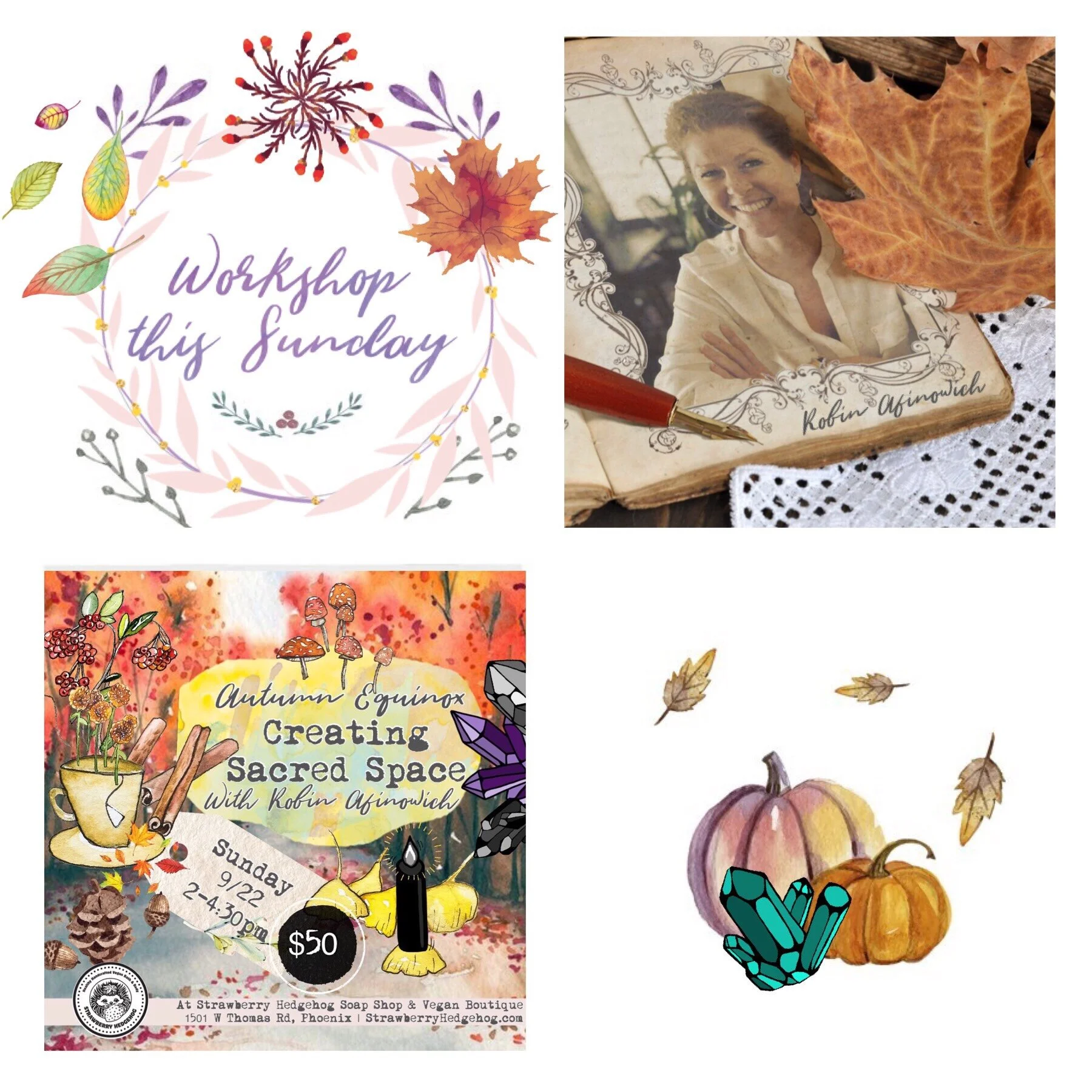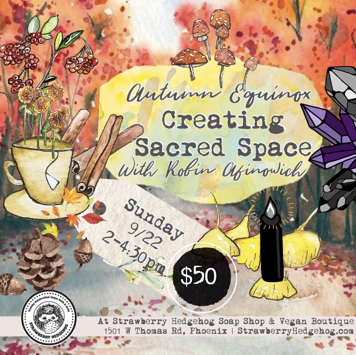 WORKSHOPS RETURN!! Just listed and will fill fast - $5 off registration for early birdies (thatβs you, now) Preregister at https://www.strawberryhedgehog.com/shop/workshops for Fall Equinox Creating Sacred Space for Daily Living with Robin Afinowich (http://Robin Afinowich.com) at the Strawberry Hedgehog Soap Shop & Vegan Boutique at 1501 W Thomas Rd, Phoenix Sunday, Sept 22, 2pm-4:30pm.