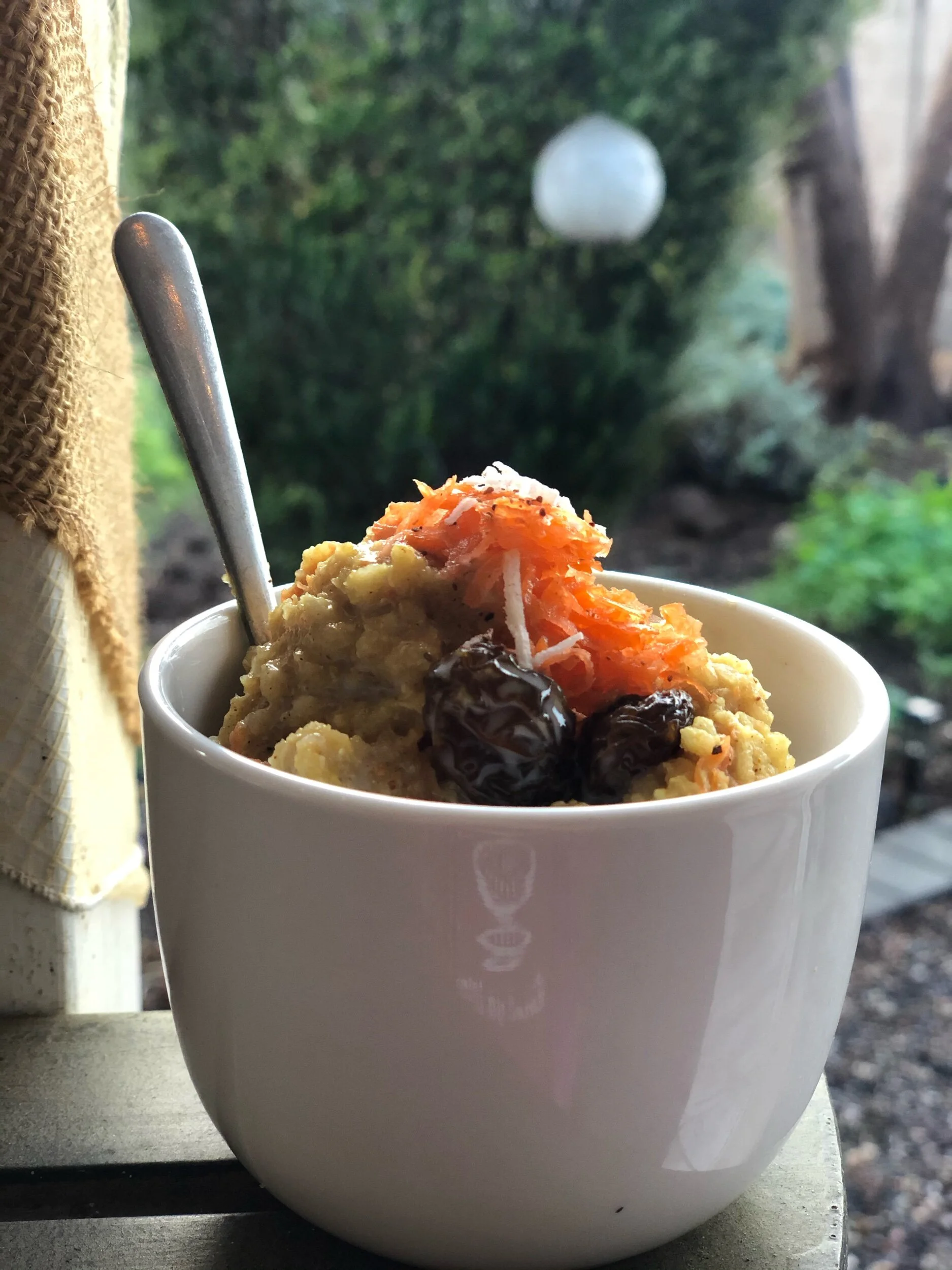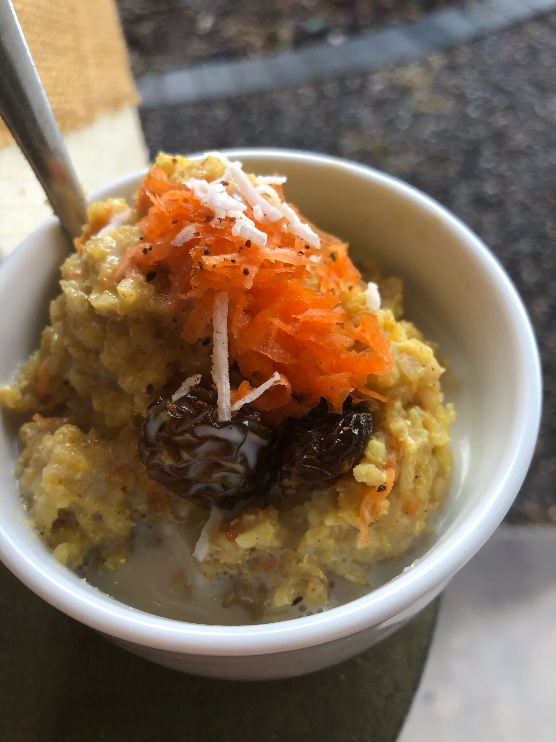 Bring the milk to a simmer, add your quinoa flakes and reduce heat. Stir until combined and let simmer for one minute then turn off heat and cover for a minute to set. Add the spices, vanilla, maple and raisins first, let sit a minute covered, add your carrots, walnuts, and coconut. Stir to combine. Add vegan margarine and more milk to top it once itβs bowled up. Enjoy!